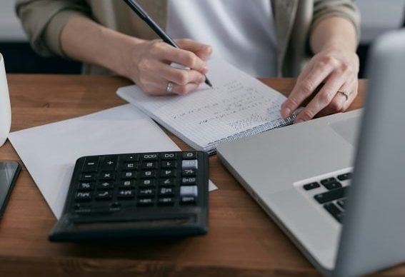 A person writes notes on paper at a desk with a laptop, calculator, and documents, suggesting they are working on financial or accounting tasks.