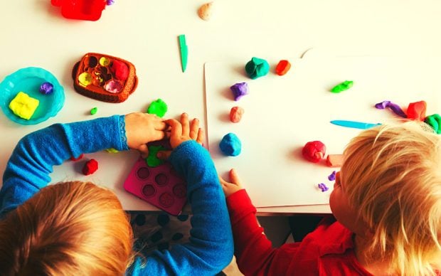 Two young children sit at a table playing with colorful modeling clay, shaping and arranging pieces on the tabletop and a white tray, surrounded by various clay tools and small containers.