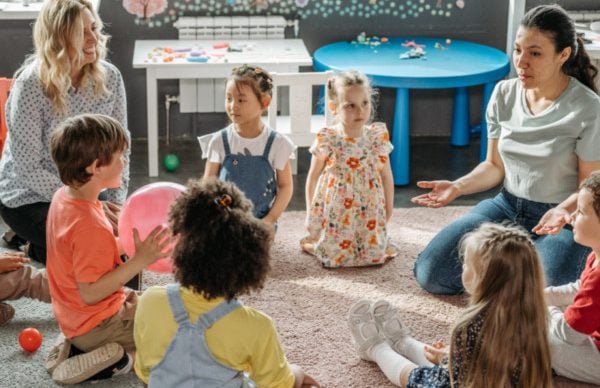 A group of young children sit in a circle on a classroom rug, listening to two adult women. The room is decorated with colorful wall art and children’s tables in the background.