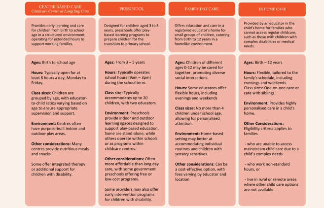 Choosing the right ECEC setting depends on what works best for your child and family. The table below compares the different options available, including key features and considerations to help guide your decision.