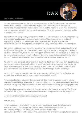 Firstly, we wrote a letter to the Kindergarten parents, introducing ourselves and Dax. We wanted them to know it was ok to acknowledge Dax’s disabilities, but we hoped they would not define him. We included some resources and also made parents aware that we were approachable for any questions.
